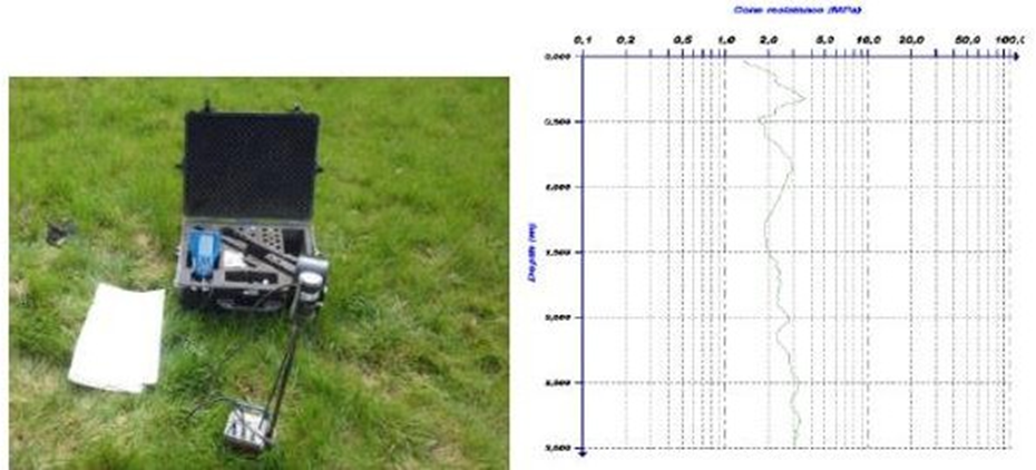 Fig. 4: Penetrómetro dinámico Panda2 y registro de penetración obtenido