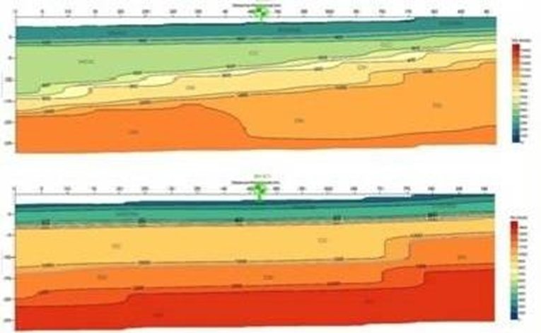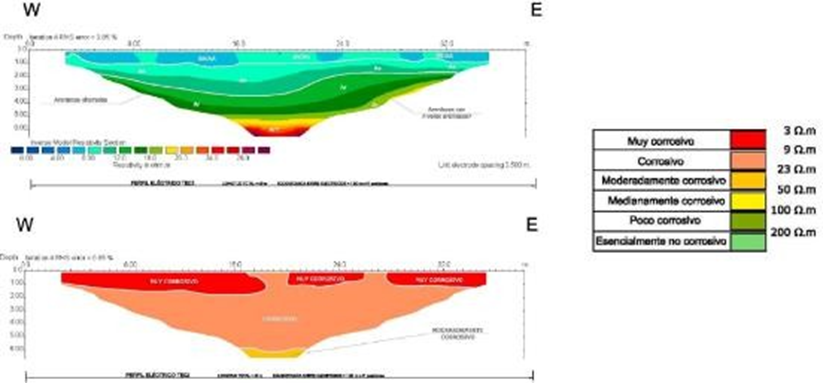 Fig. 5: Interpretación de perfil de Tomografía Eléctrica en términos geológicos y determinación del potencial de corrosividad catódica