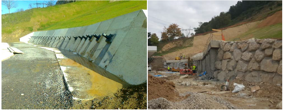 • Muro de hormigón y anclajes de cables. Como una de las medidas principales de estabilización se diseñaron anclajes activos de 8 cables con inyección repetitiva selectiva (IRS) y una profundidad total de 29 m, colocados sobre un muro de hormigón inclinado 60º con respecto a la horizontal, que actúa simultáneamente como elemento de contención y como viga de reparto.