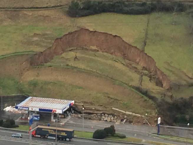 El deslizamiento citado tuvo lugar en febrero de 2015, con consecuencias desastrosas para la estación de servicio situada al pie del deslizamiento, quedando ésta completamente sepultada. La ladera afectada había sufrido modificaciones en su pendiente con objeto de la construcción de la citada estación de servicio en 1994, modificando la pendiente natural de unos 18-20º a un talud de unos 34º (3H:2V) con una altura de entre 3 y 5 metros habiéndolo reforzado con un muro de gaviones. Aunque no se conocen los detalles, el primero de los deslizamientos tuvo lugar el mismo año de la construcción de la estación de servicio, derrumbándose entre 15 y 20 m del muro de gaviones, los cuales se repararon sustituyendo el trasdós del muro de material arcilloso por gravas y contrafuertes de escollera.