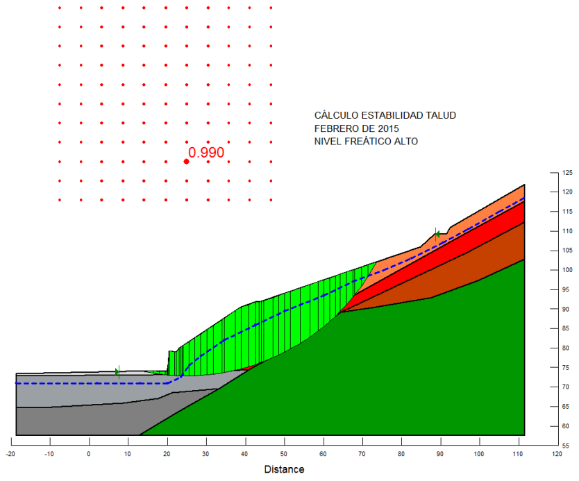 Fig. 4: Back analysis con hipótesis de nivel freático alto, Febrero de 2015. FS=0,990.