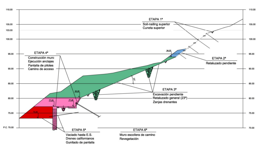La solución diseñada consistió en una combinación de soil nailing, zanjas drenantes, anclajes IRS y una pantalla de pilotes.